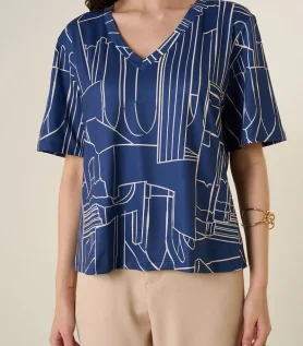 Blusa Maria.Valentina Solta Decote V Manga Curta Padrão Azul